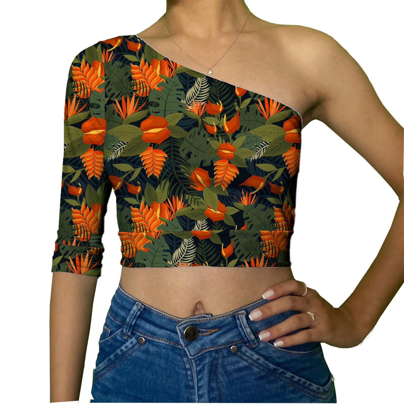 Cropped Uma Manga | Plantas Laranja. Você encontra aqui na Swag On.
