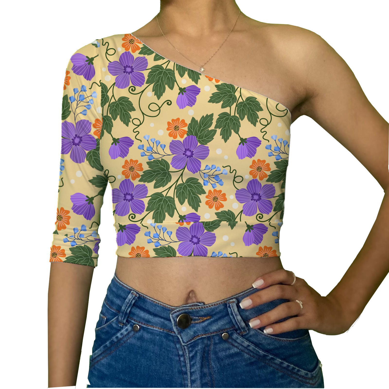 Cropped Uma Manga | Flores Roxas e Laranjas. Você encontra aqui na Swag On.