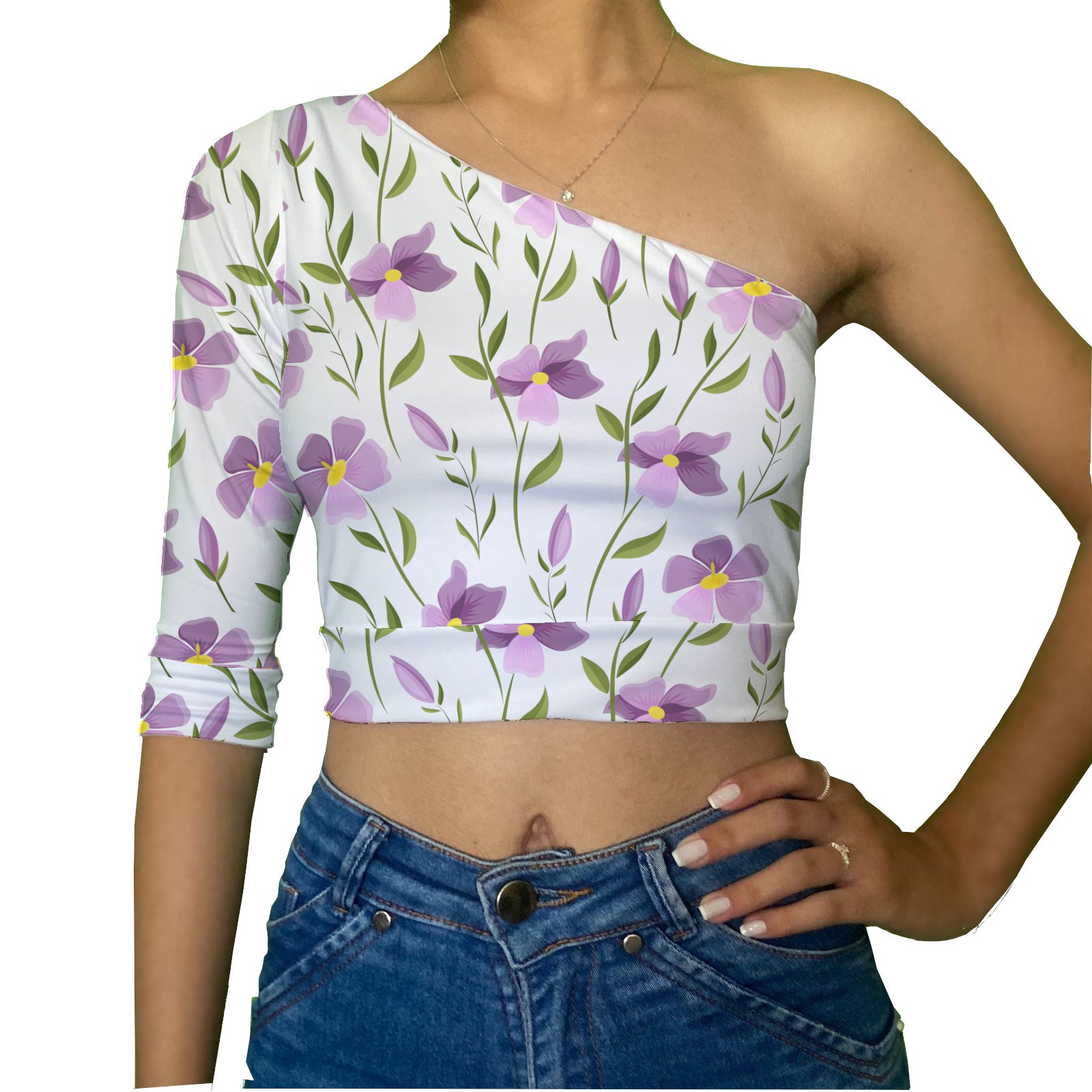 Cropped Uma Manga | Flores Roxas. Você encontra aqui na Swag On.