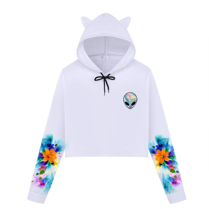 Cropped de moletom branco estampado nas mangas | Alien. Você encontra aqui na Swag On.